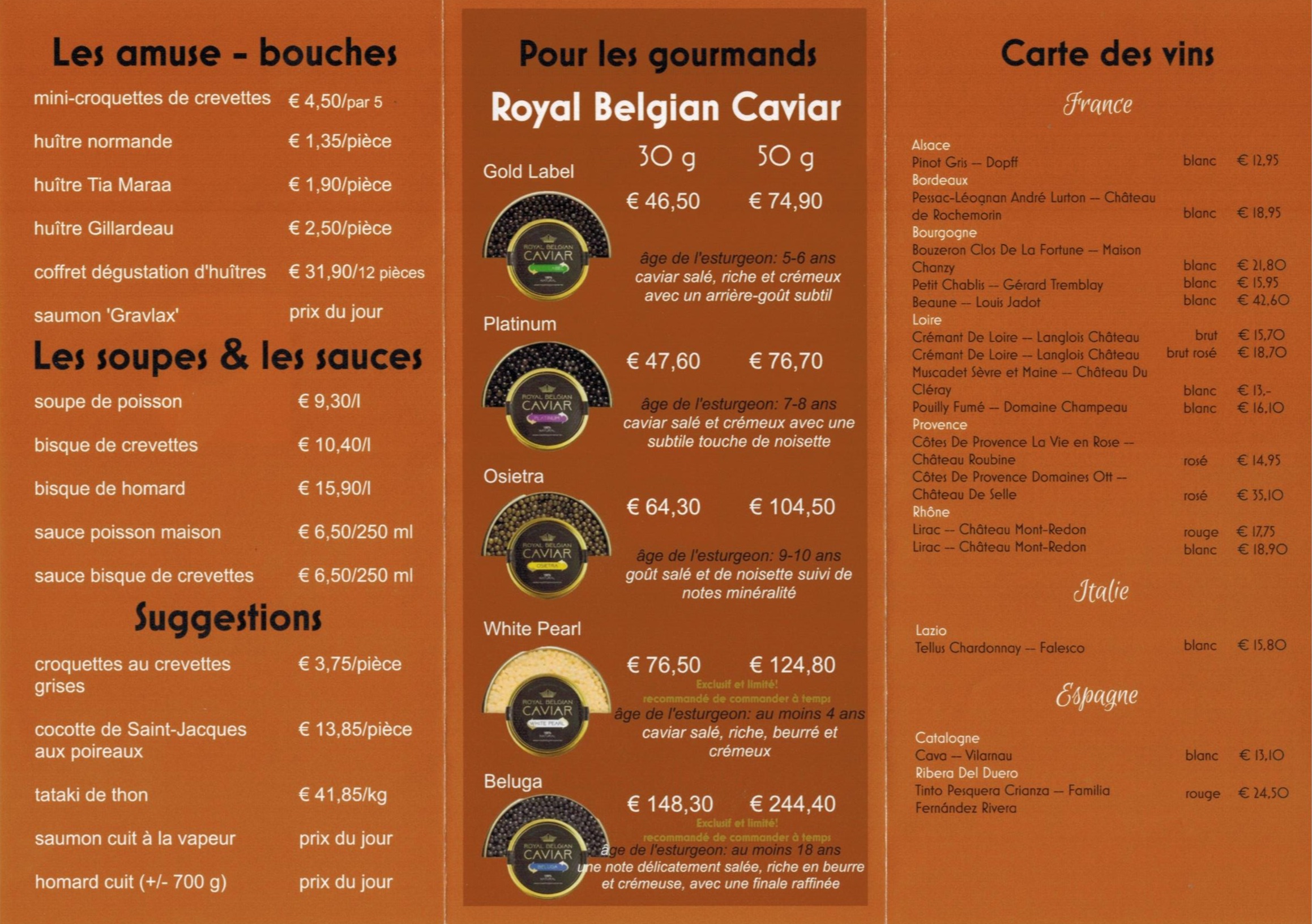 Large choix parmi les produits frais du jour suivants : homard, crabe*, crevettes grises fraîches, bulots bretons, huîtres françaises, langoustines, caramboles, crevettes royales et pattes de crabe.